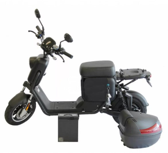 Vom Design her ist dieses Modell funktionell gehalten aber mit Zubehör wie Handyhalterung mit Ladeanschluss und einer Gepäckbox bestens ausgestattet.